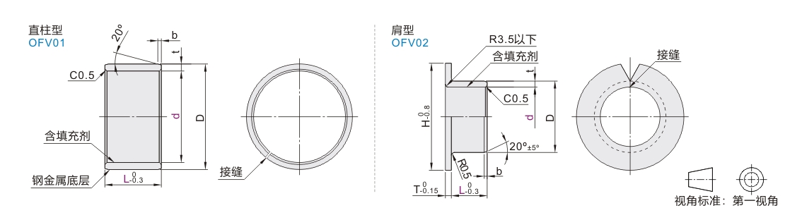 OFV01/02皆为开口卷制衬套,上表中公差皆为压入环规(±0.002)后的参考值。