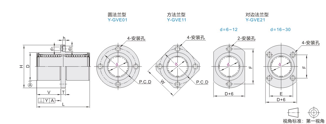 | Y-GVE01 | 中型 | 圆法兰型 | GCr15 | SUJ2 | 56HRC~ | 无电解镀镍 | GCr15 | SUJ2 | 树脂 | 丁腈橡胶 | -15~80°C |
