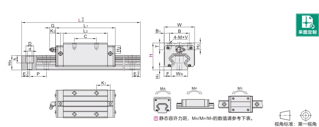 | WR | HR | D | h | d | P | 固定螺钉 | C(动) | C0(静) | MR | MP | MY | 滑块(kg) | 滑轨(kg/m) | |||||||