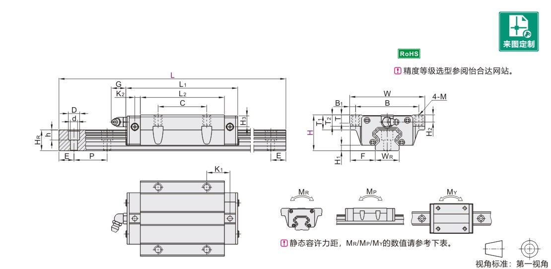 | H2 | H3 | WR | HR | D | h | d | P | 固定螺钉 | C(动) | Co(静) | MR | MP | MY | 滑块(kg) | 滑轨(kg/m) |