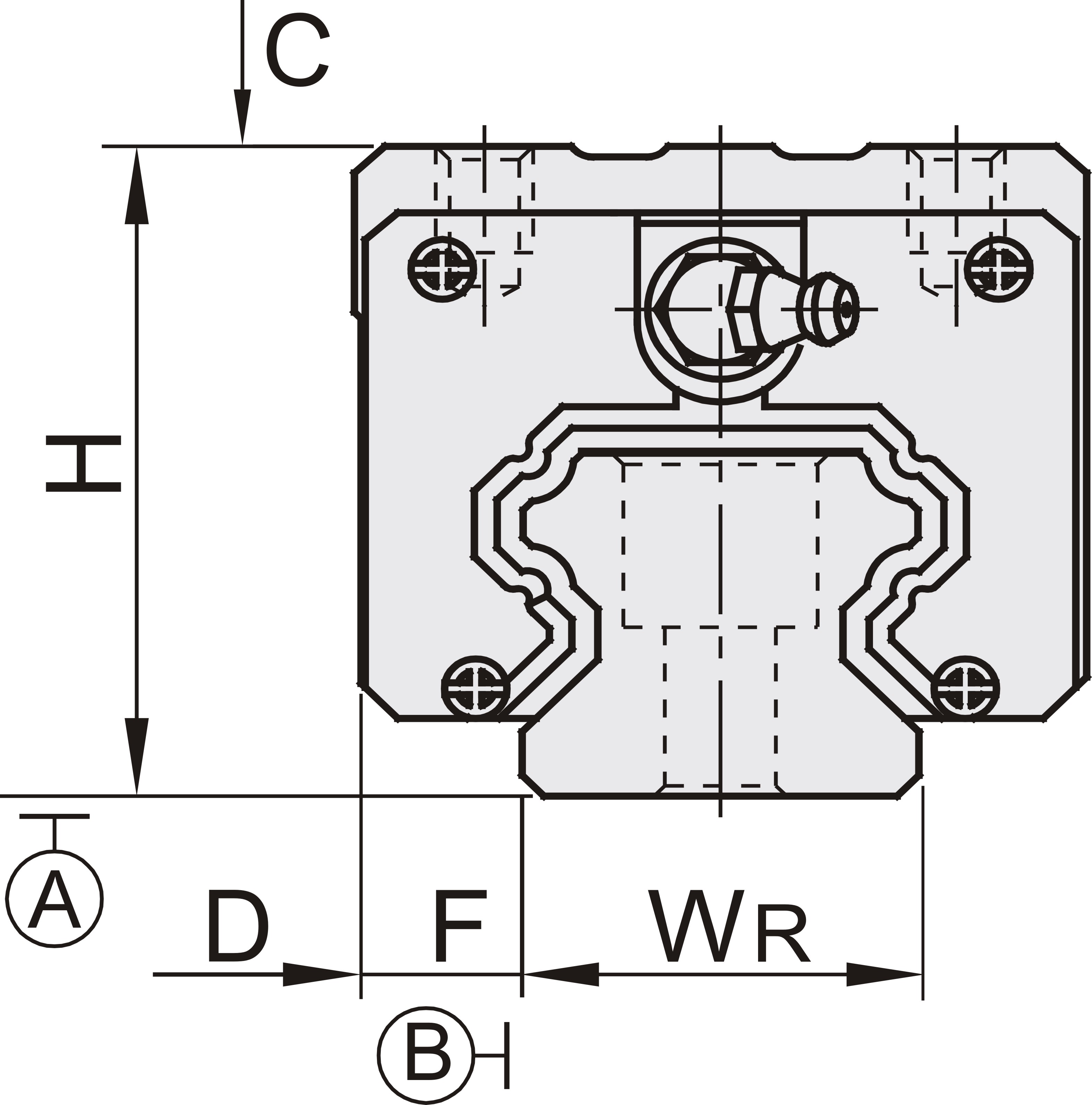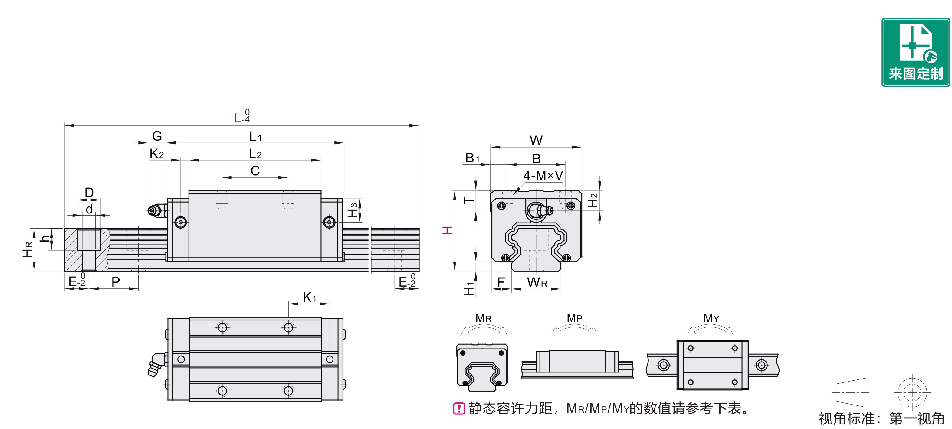 | WR | HR | D | h | d | P | 固定螺钉 | C(动) | C0(静) | MR | MP | MY | 滑块(kg) | 滑轨(kg/m) | |||||||||||||||||||||||