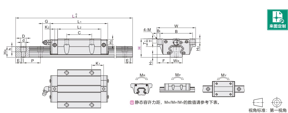 | H2 | H3 | WR | HR | D | h | d | P | 固定螺钉 | C(动) | C0(静) | MR | MP | MY | 滑块(kg) | 滑轨(kg/m) | |||||||||||||||||||||||||||||
