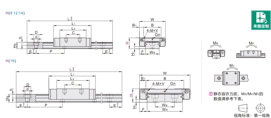 | WR | WB | HR | D | h | d | P | 固定螺钉 | C(动) | C0(静) | MR | MP | MY | 滑块(kg) | 滑轨(kg/m) | ||||||||||||||||||||||||