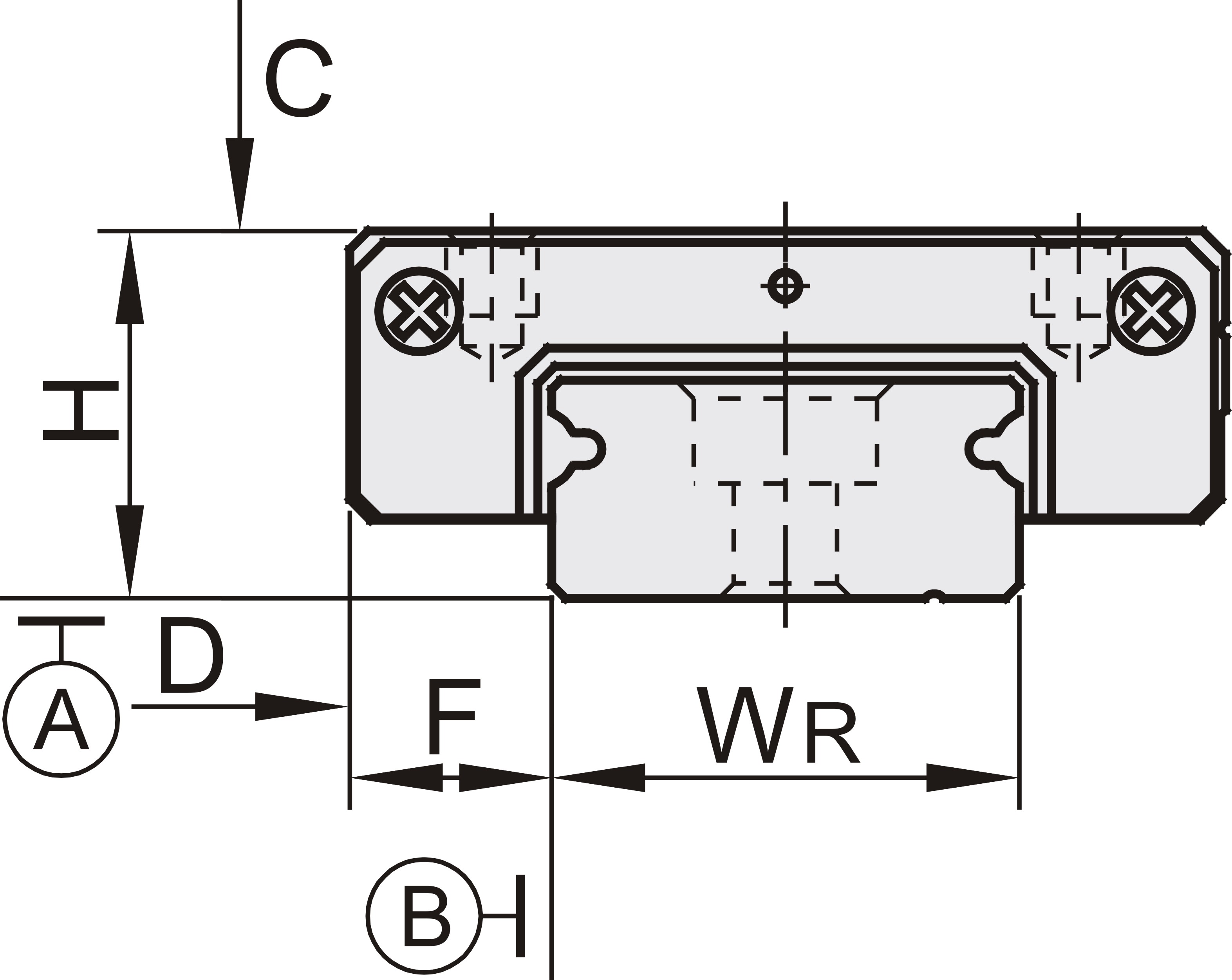 | WR | WB | HR | D | h | d | P | 固定螺钉 | C(动) | C0(静) | MR | MP | MY | 滑块(kg) | 滑轨(kg/m) | |||||||||||||||||||||||