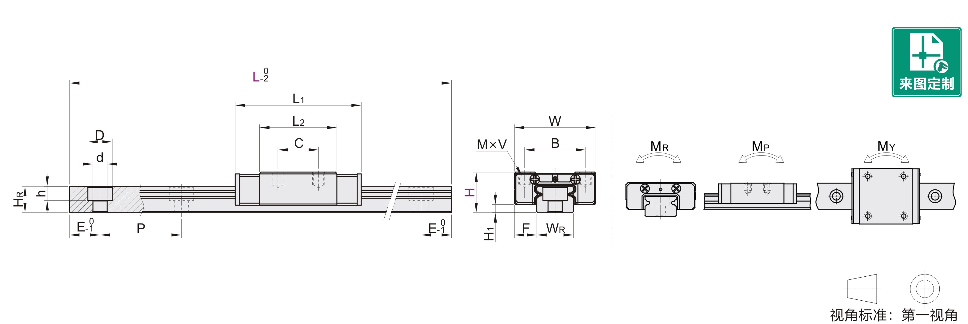 | 代码 | H | D | d | h | P | C(动) | Co(静) | MR | MP | MY | 滑块(Kg) | 滑轨(Kg/m) |