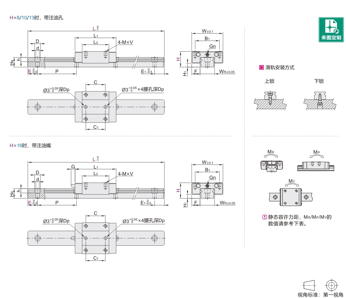 | 代码 | H | WR | HR | D | h | d | P | 上锁 | 下锁 | C(动) | CO(静) | MR | MP | MY | 滑块(Kg) | 滑轨(Kg/m) |