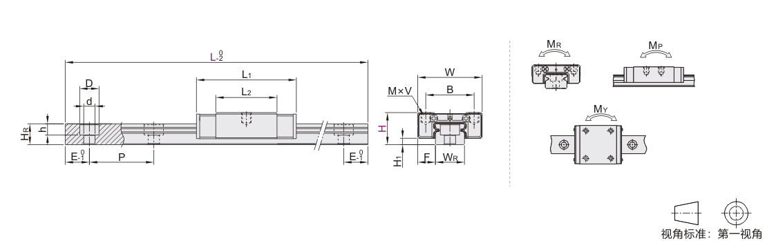 | 代码 | H | D | d | h | P | C(动) | Co(静) | MR | MP | MY | 滑块(kg) | 滑轨(kg/m) |
