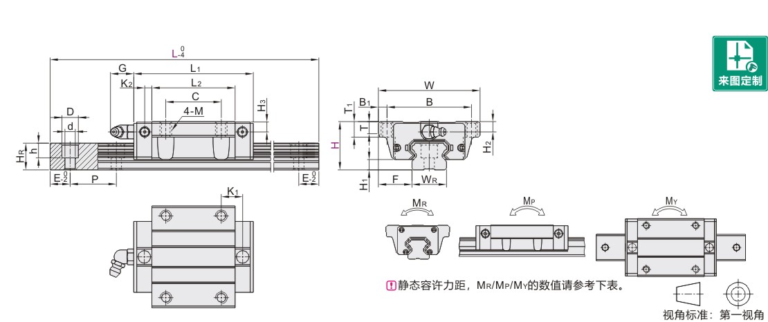 | WR | HR | D | h | d | P | 固定螺钉 | C(动) | C0(静) | MR | MP | MY | 滑块(kg) | 滑轨(Kg/m) | ||||||||||||||