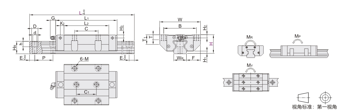 | H2 | H3 | WR | HR | D | h | d | P | 固定螺钉 | C(动) | Co(静) | MR | MP | MY | 滑块(kg) | 滑轨(kg/m) |
