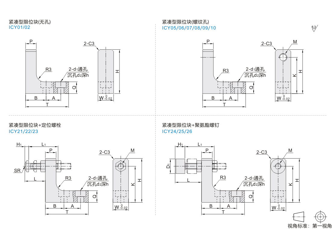 | ICY01 | 单件 | 紧凑型限位块 | 无孔 | — | S45C | 镀硬铬 | — |