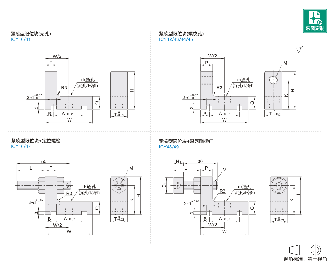 | ICY46 | 组件 | 紧凑型限位块+定位螺栓 | 螺纹孔 | 粗牙 | S45C | 镀硬铬 | TAY02 | TBK55 |