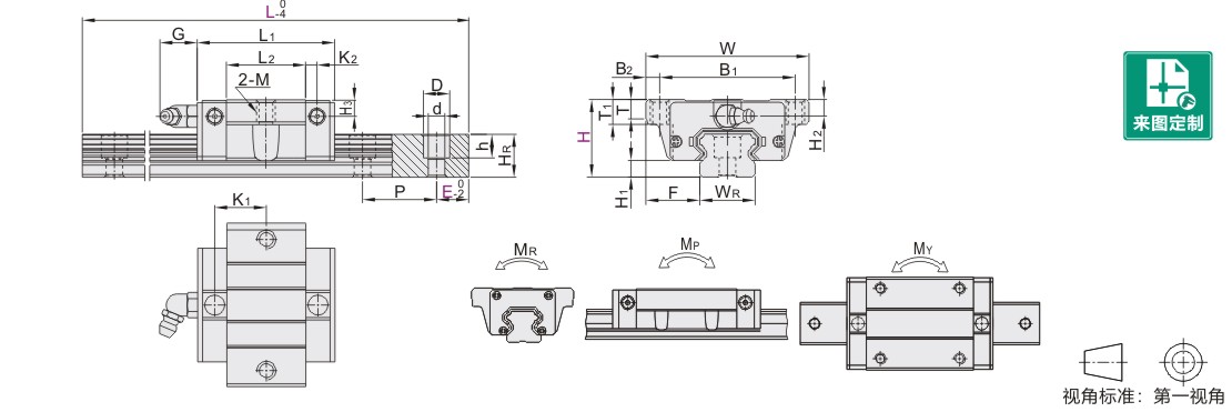 | WR | HR | D | h | d | P | 固定螺钉 | C(动) | Co(静) | MR | MP | MY | 滑块(kg) | 滑轨(kg/m) | |