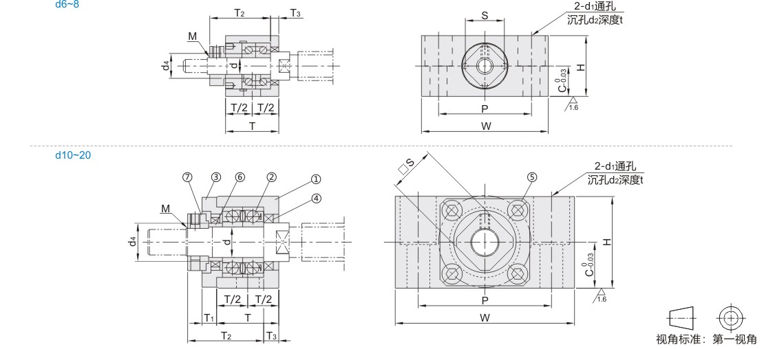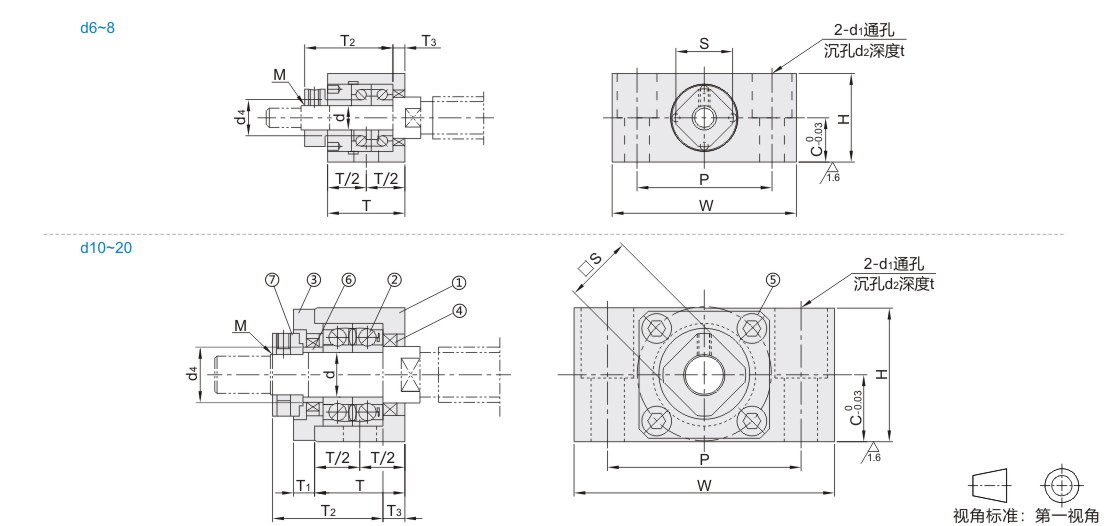 | 型号 | d | T | T1 | T2 | T3 | W | H | C | P | d1 | d2 | t | M (细牙螺纹) |