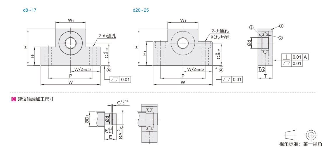 | 型号 | Ød | T | W | H | C | W1 | H1 | P | Ød1 | Ød2 | t | 建议轴端加工尺寸 | 使用C型挡圈 | ||||||||