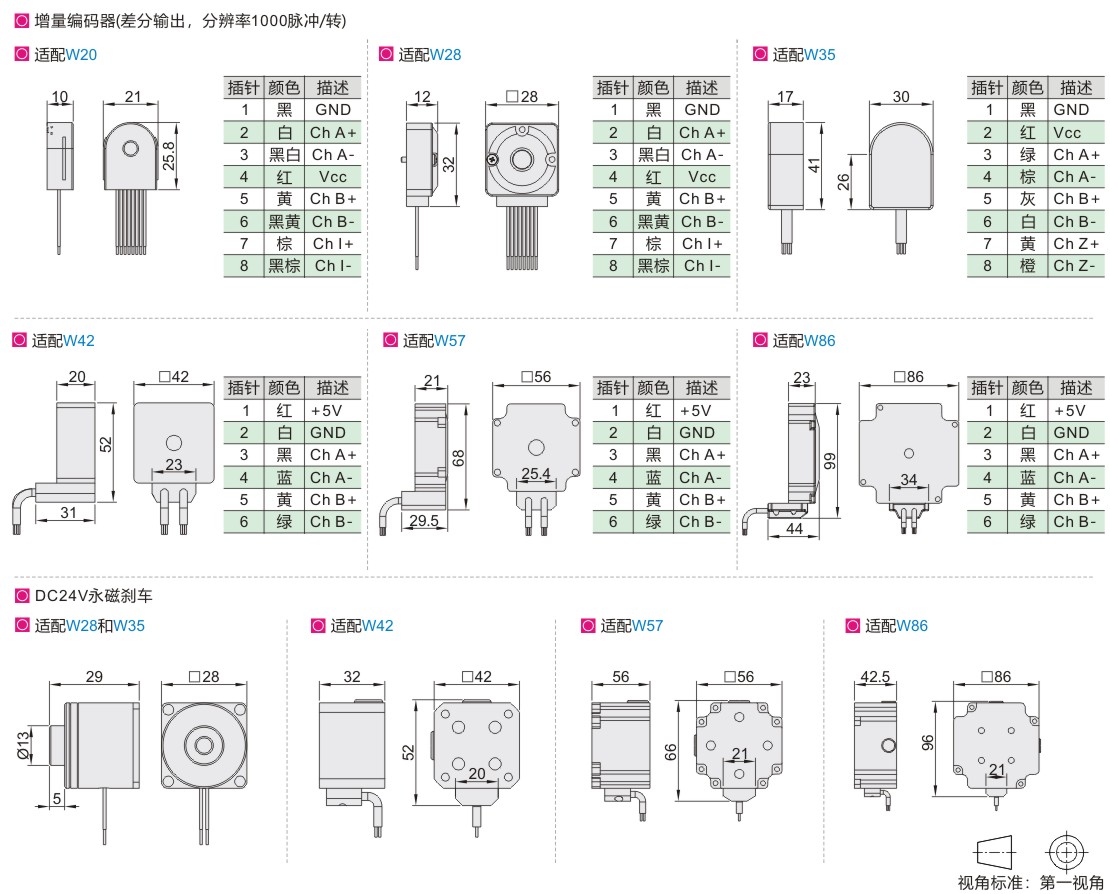 丝杆步进电机配有引出线,20和28系列约为320mm,其余系列约为500mm,红、红白、绿、绿白分别对应驱动器A+、A-、B+、B-。