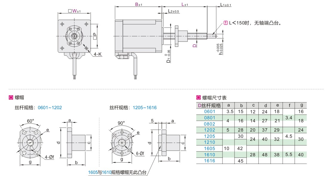 1202表示直径为12,导程为02。 ★当W35/42时,D丝杆规格0801,0802对应h=6和L1=6;D丝杆规格1202,1205,1210对应h=8和L1=8。
