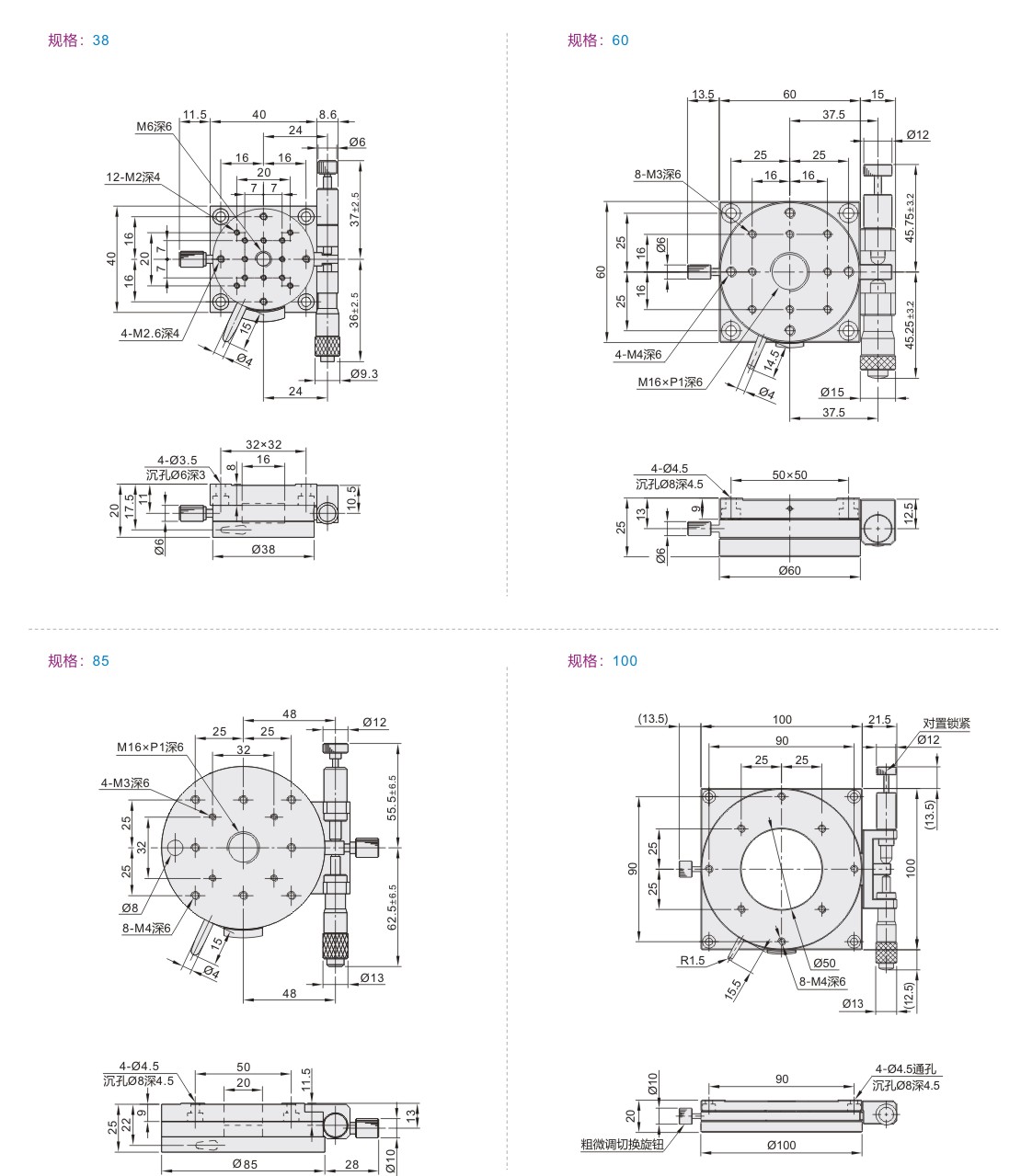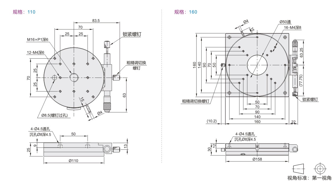 | ELF01 | 千分尺进给型 | θ轴 | 铝合金 | 黑色阳极氧化 |