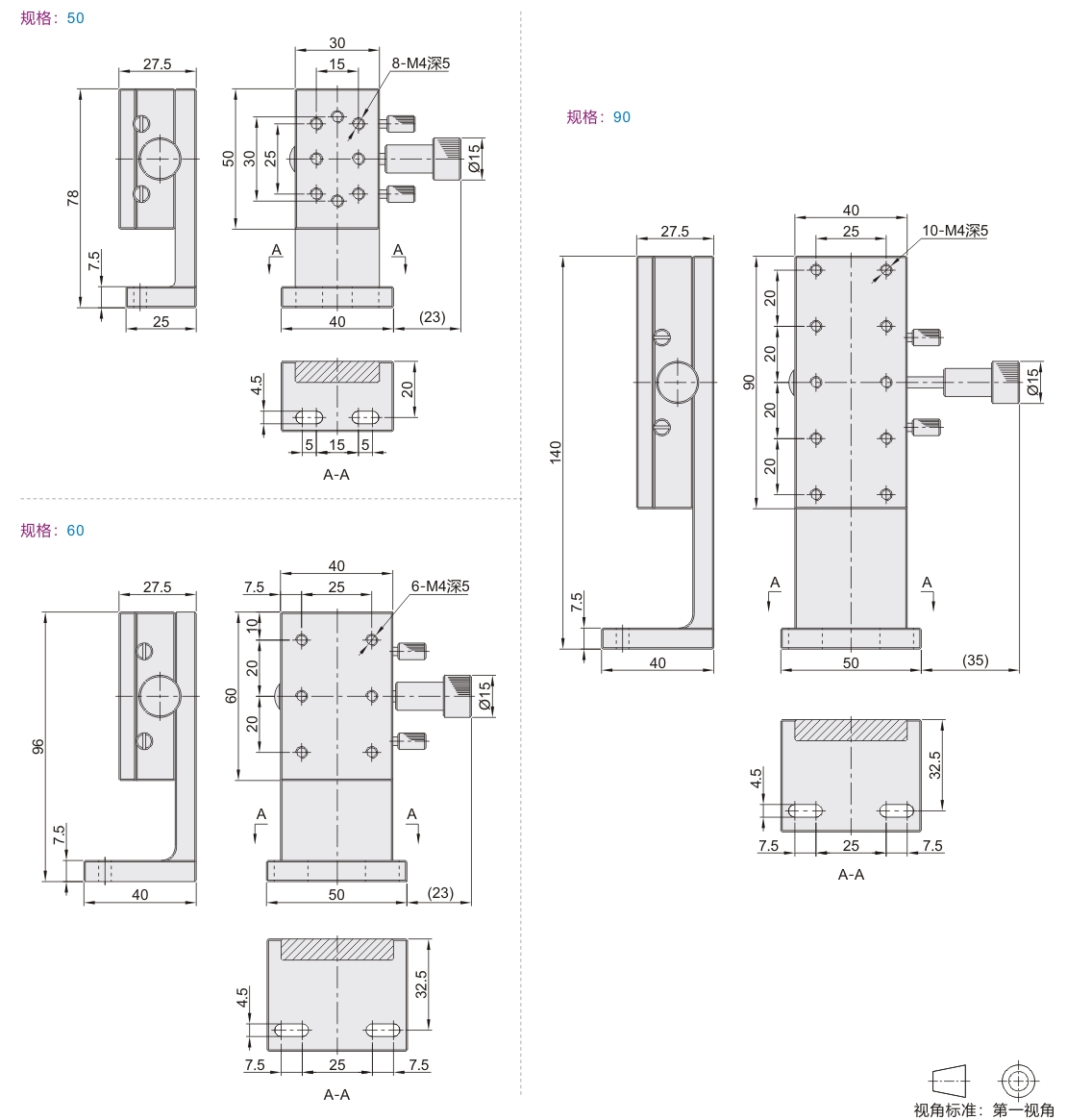 经济型手动位移台 Z轴 燕尾槽式 齿轮齿条驱动式 薄型 铝合金/黄铜材质 黑色阳极氧化处理