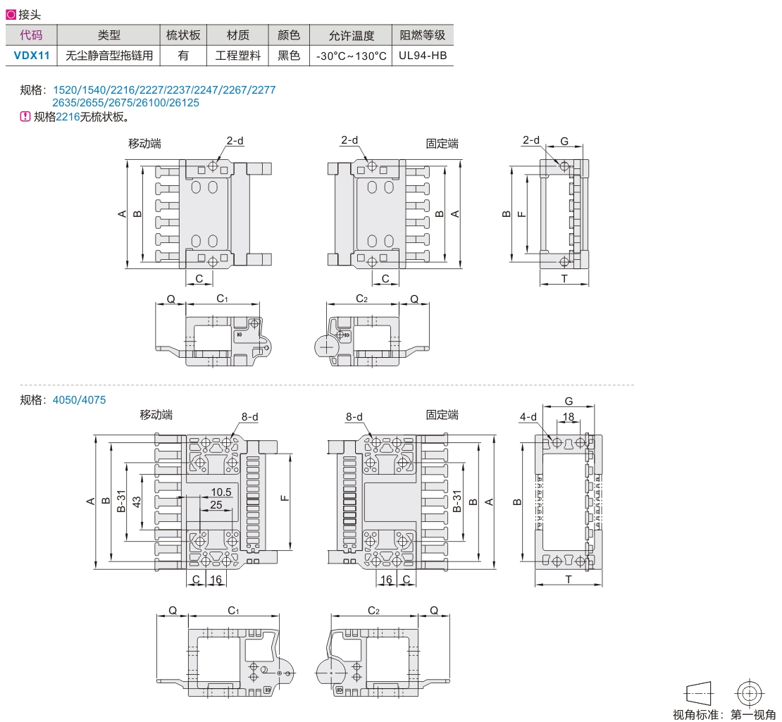 本系列拖链标准型号包含一套接头(移动端、固定端各一个)。