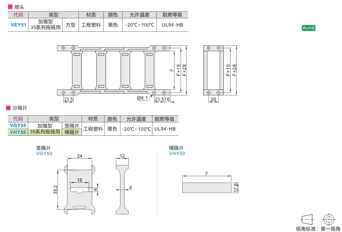 | VBY51 | 35系列拖链 | 35 | 内外径打开 | 桥式 | 单腔 | 工程塑料 | 黑色 | -20℃~100℃ | UL94-HB | 接头 |