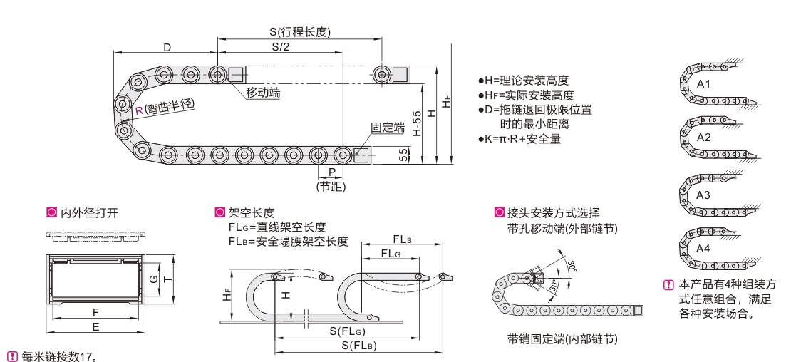 本系列拖链标准型号包括一套接头(移动端 、固定端各一个)。