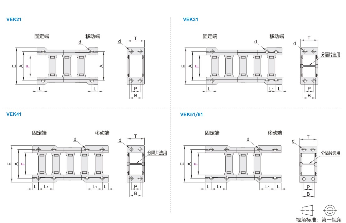 | 型号 | A | E | L | L1 | B | T | P | d | 适用拖链 | ||||||||||||||||||||||||||||