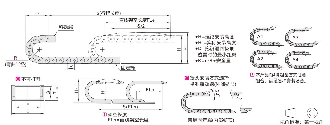 将拖链弯曲后,横杆打开指向弯曲的圆心方向,则为内径打开,横杆打开背离圆心方向,则为外径打开。