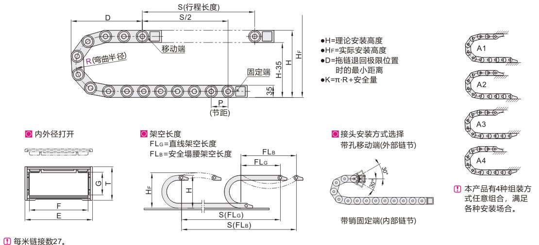 本系列拖链标准型号包括一套接头(移动端 、固定端各一个)。