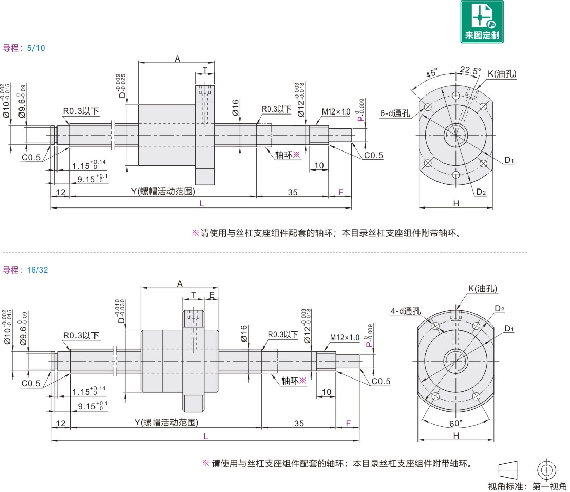 丝杠轴径 | 导程 | 支座形状 | 推荐丝杠固定座(页码) | 推荐丝杠支撑座(页码) | |