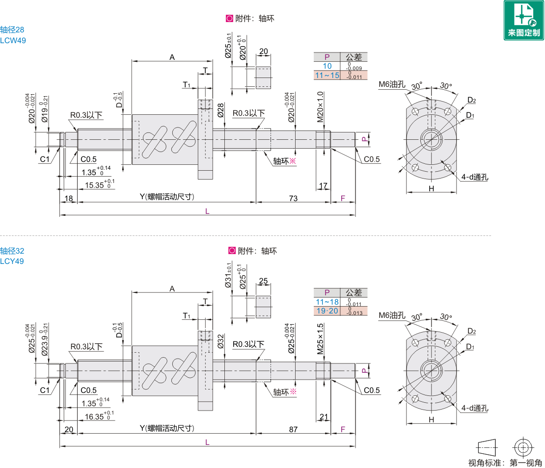 | LCW49 | 标准螺帽型 | C10 | 28 | S55C | SCM420 | 感应加热淬火 | 渗碳淬火 | 56~62HRC | 58~62HRC |