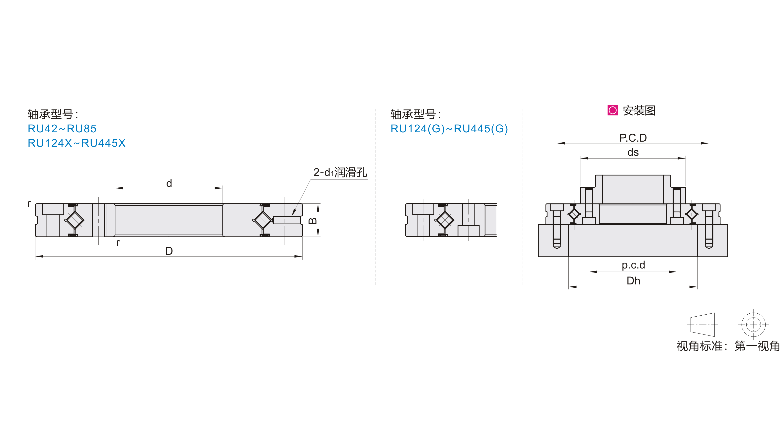 | RU | 内外环一体型 | UU(两端密封垫片) 无标记(内环与外圈的沉孔为同一方向) G(内环与外圈的沉孔为反方向) X(内环螺纹孔(通孔)) |