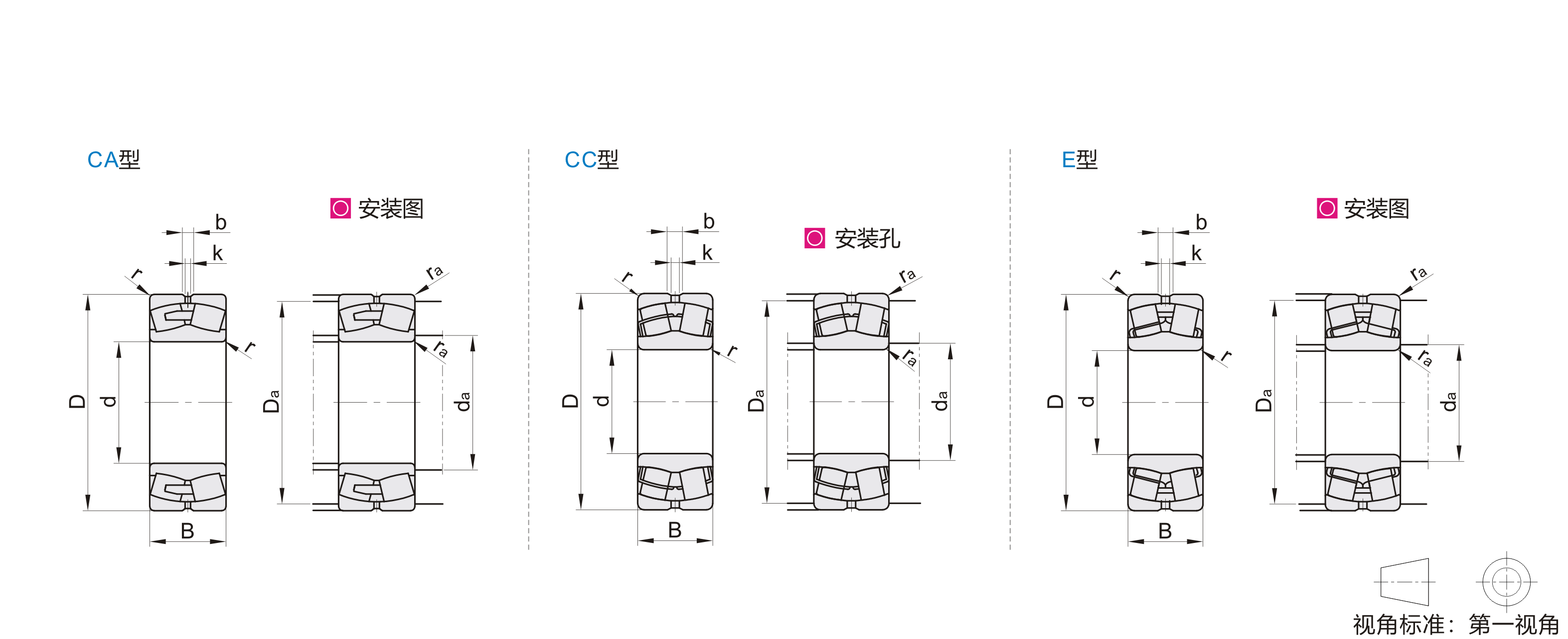 CA(铜保存架,内圈两侧有挡边) CC(钢保持架,内圈无挡边) E(钢保持架,内圈无挡边,优化的 内部设计,用于提高承载能力) |