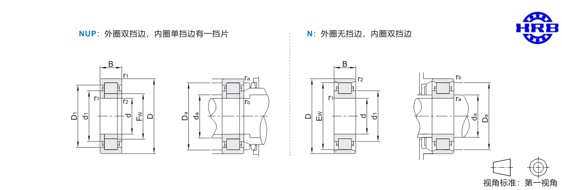 | HRB | NUP:外圈双挡边,内圈单挡边有一挡片 N:外圈无挡边,内圈双挡边 |
