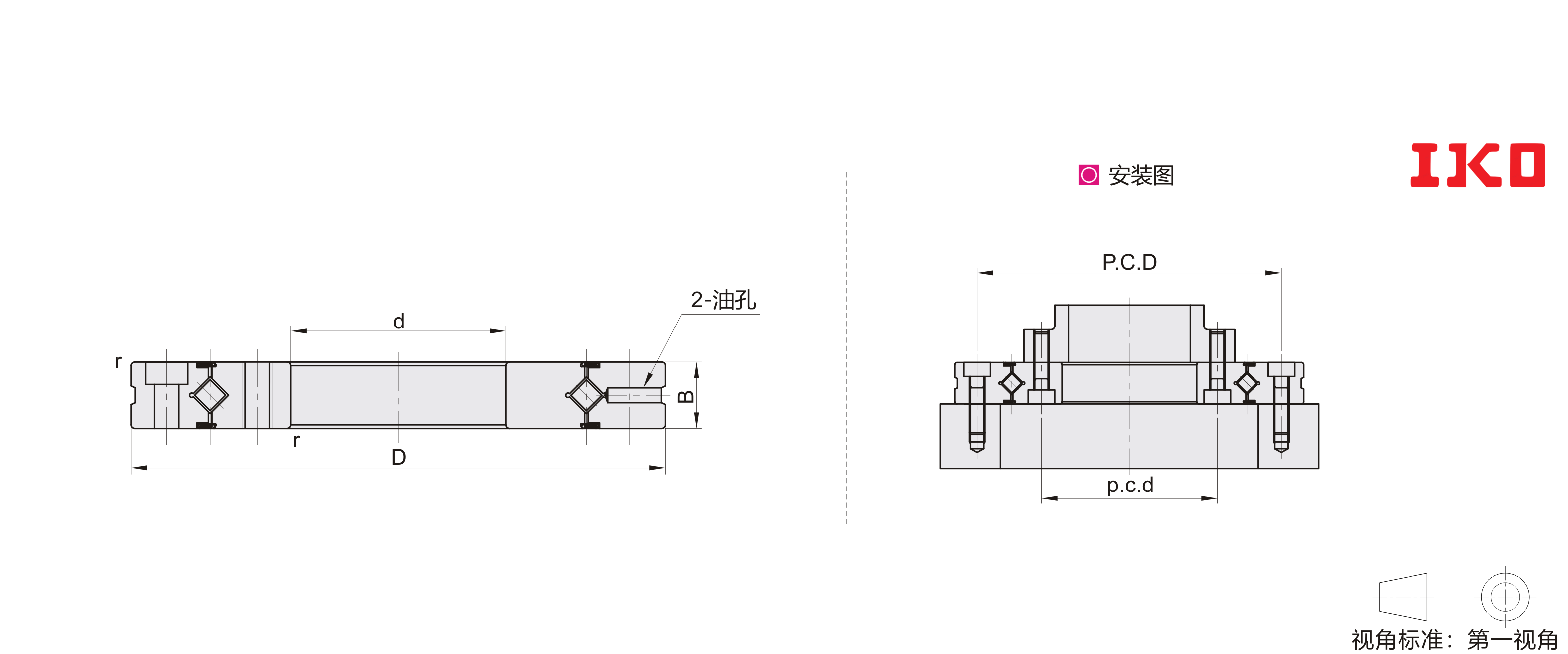 | 代码 | 规格 | d | D | B | r(min) | Cr(动) | Co(静) | p.c.d | 安装孔 | P.C.D | 安装孔 | |