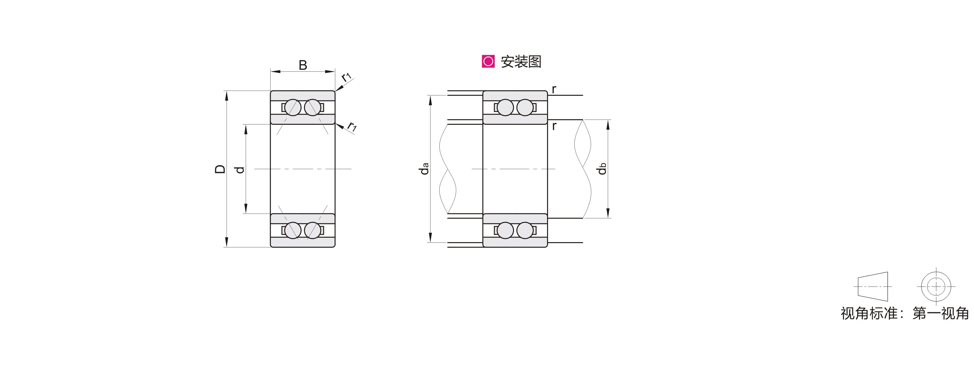 | 代码 | 轴承型号 | Cr(动)KN | Cor(静)KN | 脂润滑 | 油润滑 | db (min) | da (max) | r (max) | |||||
