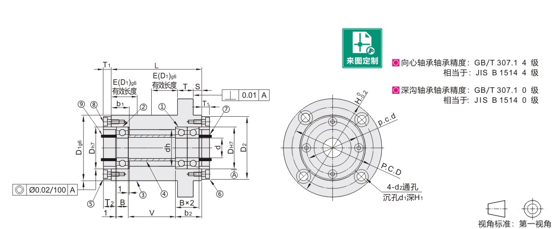 ③固定座 ④内圈用调整环 ⑥油封用盖板/O形圈用盖板 ⑦⑨内圈固定用套环 |