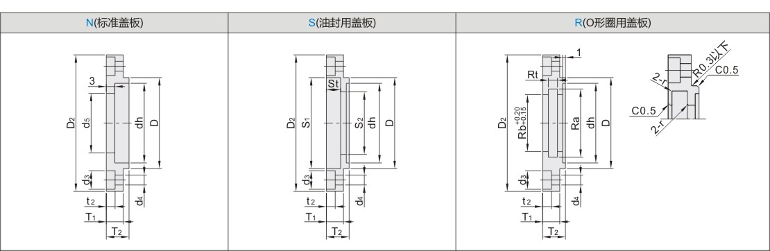 S(油封用盖板) | R(O形圈用盖板) | 内径 | 外径 | 厚度 | |||||||||
