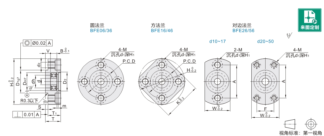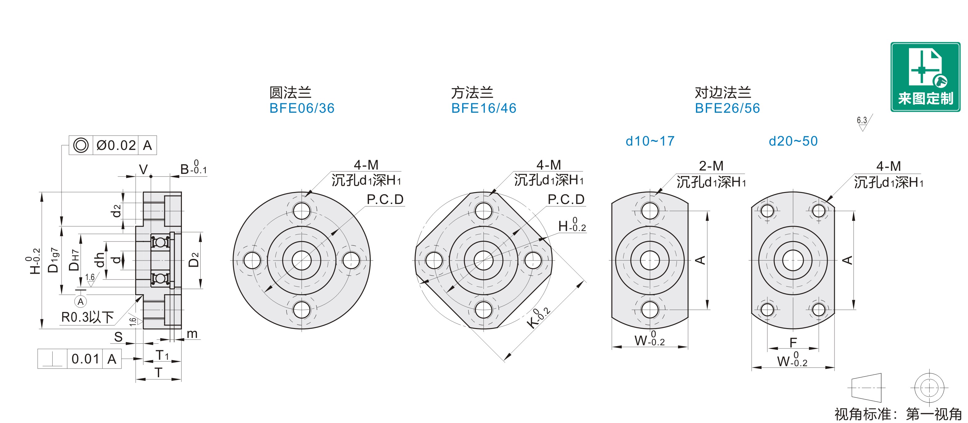 | 圆法兰 | 方法兰 | 对边法兰 | 轴承 | 轴承座 | 挡圈 | ||