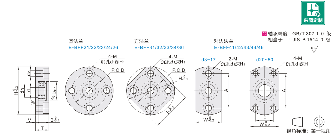 | 圆法兰 | 方法兰 | 对边法兰 | 轴承 | 轴承座 | 挡圈 | 轴承座 |