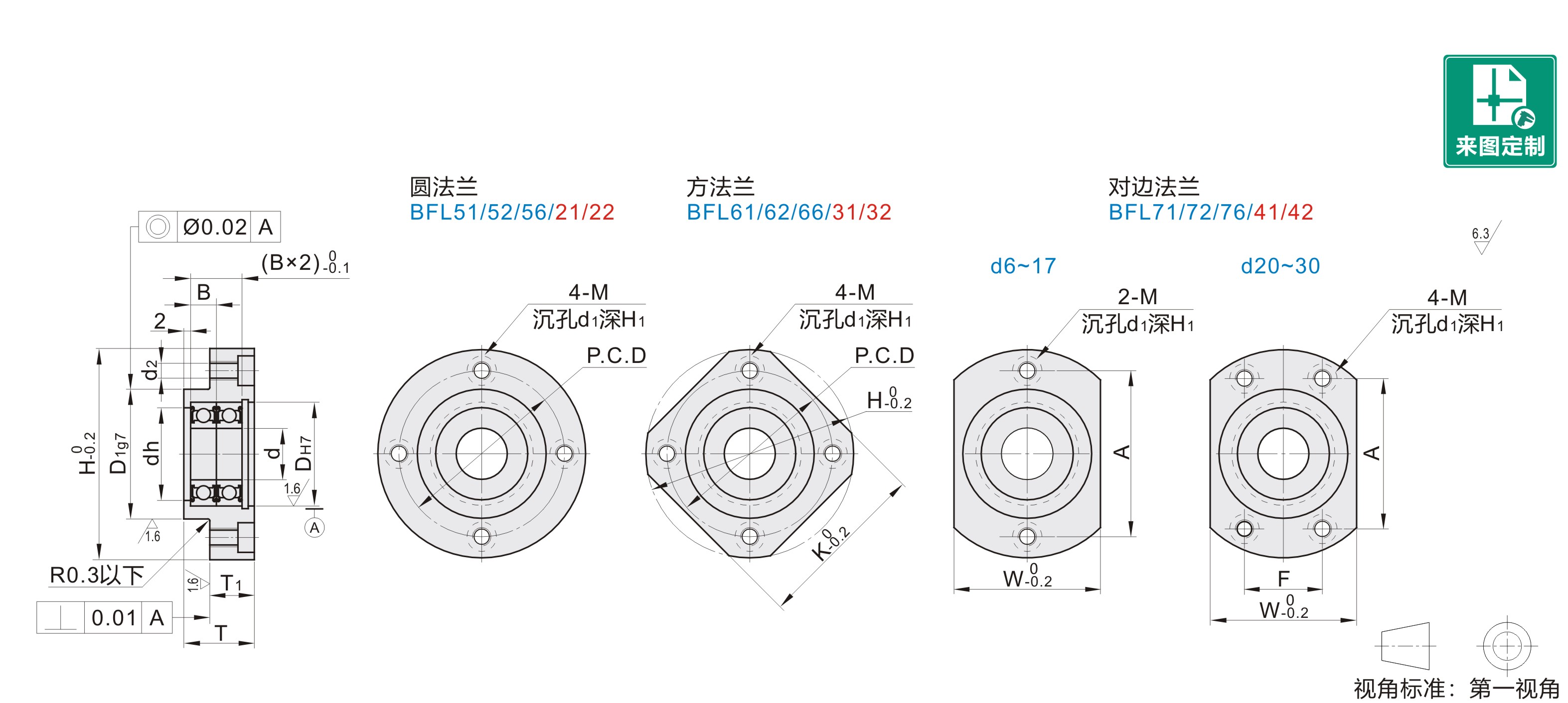 | 圆法兰 | 方法兰 | 对边法兰 | 轴承 | 轴承 | 轴承座 | 挡圈 | 轴承座 |