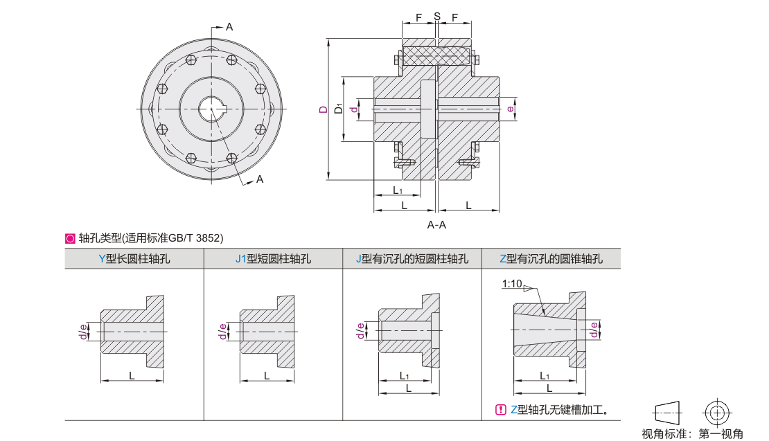 | 型号 | d-e | 轴孔类型 | 轴孔长度 | D1 | S | F | 额定 扭矩 (N ·m) |