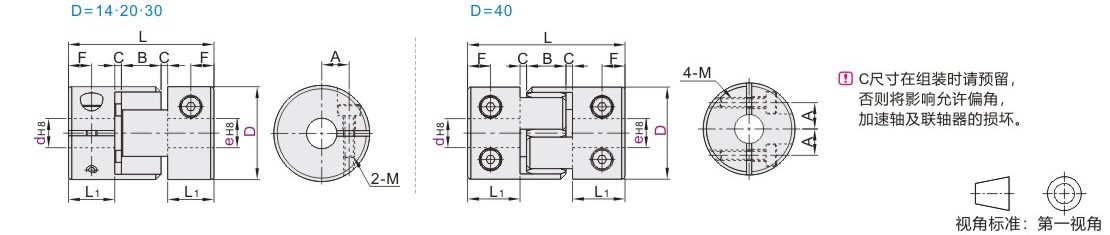 | 型号 | L | L1 | B | C | F | A | M | 锁紧扭矩(N·m) | 额定扭矩(N·m) | 容许安装偏差 | 静态扭转刚性 (N ·m/rad) |