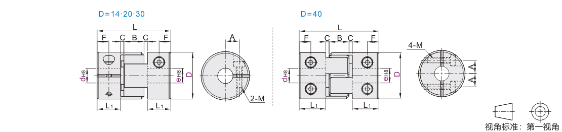 | 型号 | L | L1 | B | C | F | A | M | 锁紧扭矩(N·m) | 额定扭矩(N·m) | 容许安装偏差 | 静态扭转刚性 (N·m/rad) |