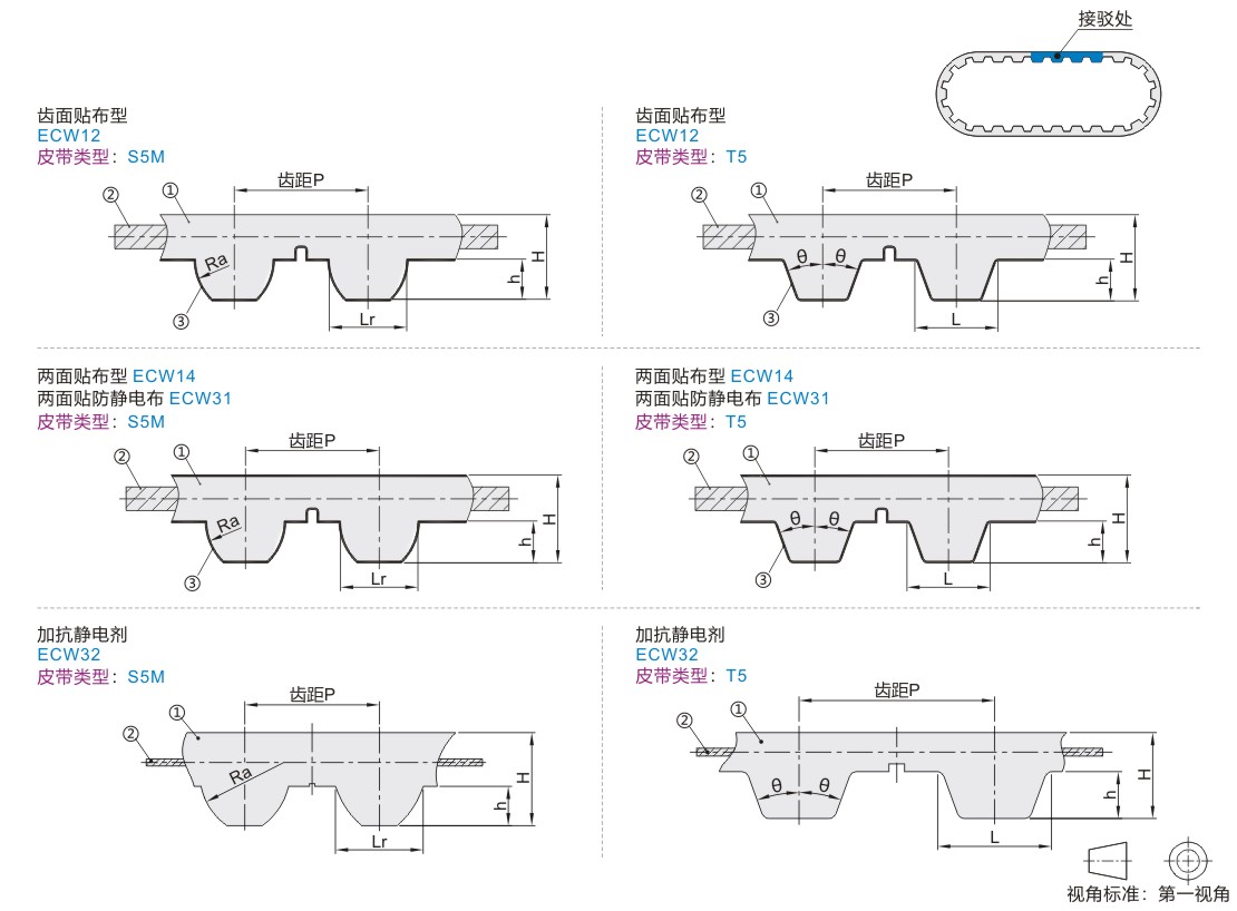 皮带的周长为芯线长度,周长=齿数×齿距(注:ECW12/ECW14/ECW31/ECW32选型为齿数)。