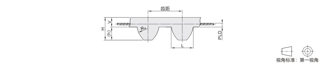 | 代码 | 齿形 | 齿距 | L | (h) | H | V | Ra | PLD |