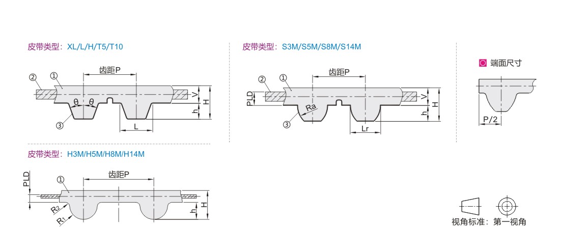 | 齿型 | 齿距P | Lr | h | H | V | Ra | PLD | ||||||||