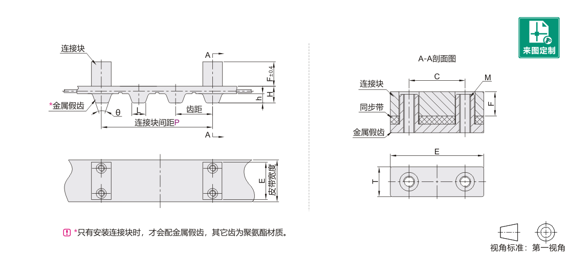 附件安装在皮带齿正上方的背面,全长为齿数×齿距;