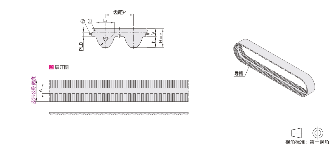 | 代码 | 齿距P | Ra | Lr | H | h | V | PLD |
