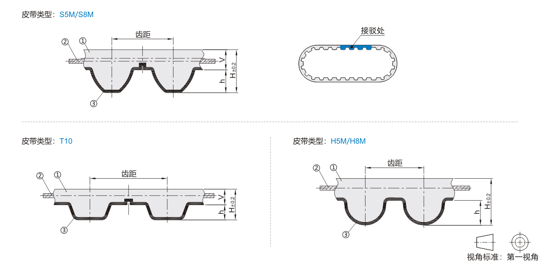 | 代码 | 齿型 | 齿距 | h | H | V | 单位带重(g/1mm×1m) |