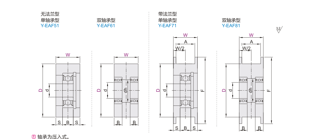 | 型号 | D | 适用皮带宽度 | F | A | S | 轴承尺寸 | 使用挡圈 (见官网) |